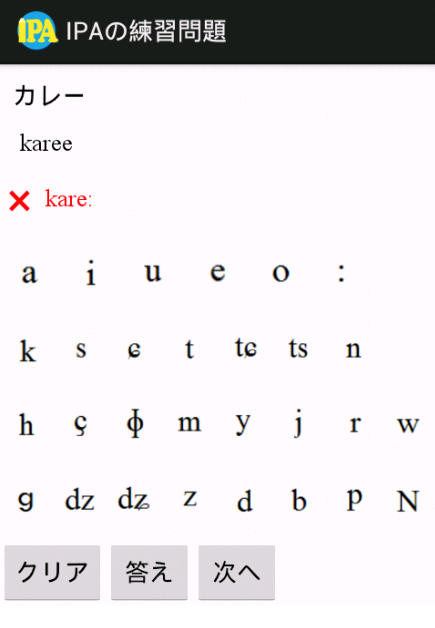 「答え」のボタンを押すと、「○/×」と正しいIPAでの表記が表示されます。