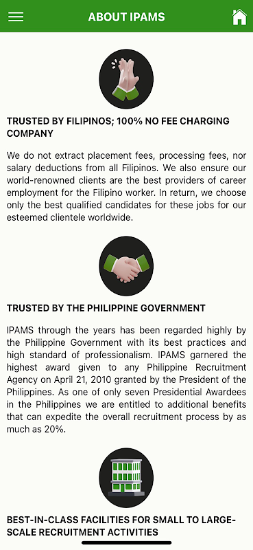 ผ่าน IPAMS App คุณสามารถให้ทันการเปิดงานในปัจจุบันตารางเวลาการรับสมัครงานจัดหาจังหวัดสัมภาษณ์สุดท้ายของนายจ้างและได้รับแจ้ง IPAMS ข่าวล่าสุดเกี่ยวกับการรับสมัครงานในประเทศและต่างประเทศ