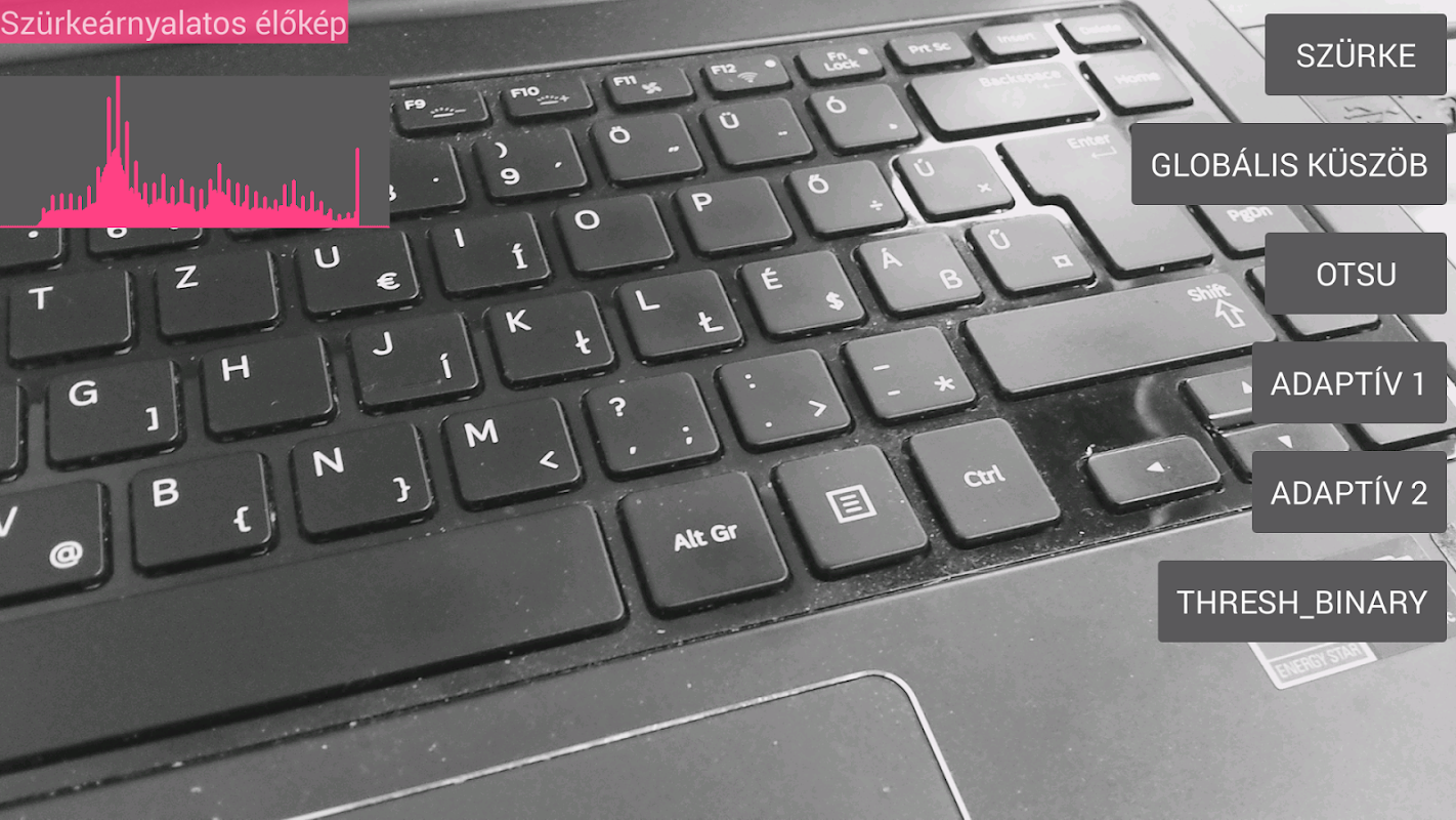 app นี้ visualizes ฟังก์ชั่นกำหนดเกณฑ์ขั้นต่ำของห้องสมุด OpenCV เราสามารถเลือกจาก LiveView สีเทาเดิมกำหนดเกณฑ์ขั้นต่ำระดับโลกที่มีค่าที่เลือกเกณฑ์การโต้ตอบกำหนดเกณฑ์ขั้นต่ำทั่วโลกโดยใช้วิธี Otsu และทั้งสองประเภทของวิธีการปรับตัว แสงที่มุมมองสดของสีเทาภาพเดิมยังแสดงให้เห็น นี่เป็นเส้นสีขาวหมายถึงค่าเกณฑ์ที่เกิดขึ้นจริง ในกรณีที่การปรับตัวเกณฑ์คำนวณสำหรับแต่ละพิกเซลเป็นรายบุคคล