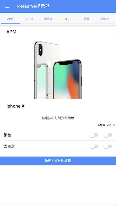 免費為用戶提供 iReserve 開賣資訊,用戶可跟據需要自訂指定分店指定型號 iPhone 開賣通知,並且提供 bot 功能,可以更快搶購 iPhoneX。