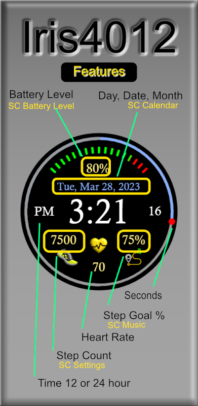 Iris4012 เป็นนาฬิกาดิจิตอลที่เรียบง่ายและใช้งานได้จริงพร้อมตัวเลือกหลากสีสันมากมาย หน้าปัดแสดงวัน วันที่ และเดือน เวลาจะแสดงในรูปแบบ 12 ชั่วโมงหรือ 24 ชั่วโมง และตั้งค่าโดยอัตโนมัติตามการตั้งค่ารูปแบบเวลาของสมาร์ทโฟน แสดงเปอร์เซ็นต์แบตเตอรี่ อัตราการเต้นของหัวใจ การนับก้าว และเปอร์เซ็นต์เป้าหมายจำนวนก้าว มี 5 ตัวเลือกสีที่กำหนดเองให้เลือก รองรับภาษาส่วนใหญ่ ดูคู่มือคุณสมบัติสำหรับรายละเอียด
