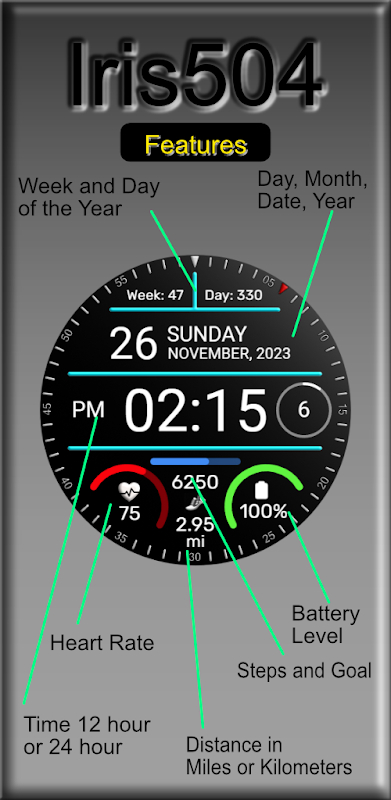 Iris504 เป็นนาฬิกาดิจิตอลที่เรียบง่ายและใช้งานได้ดี พร้อมด้วยตัวเลือกสีสันสดใสมากมาย หน้าปัดนาฬิกาแสดงวัน วันที่ เดือน และปี เวลาจะแสดงในรูปแบบ 12 ชั่วโมงหรือ 24 ชั่วโมงและตั้งค่าโดยอัตโนมัติตามการตั้งค่ารูปแบบเวลาของสมาร์ทโฟน เปอร์เซ็นต์แบตเตอรี่ อัตราการเต้นของหัวใจ และจำนวนก้าวจะแสดงขึ้น ระยะทางจะแสดงเป็นไมล์หรือกิโลเมตรขึ้นอยู่กับประเทศต้นทาง มีสีพื้นหลังให้เลือกถึง 8 แบบ มีรูปแบบสีเส้นถึง 8 แบบเช่นกัน 8 สีหมายเลขดัชนีและ 8 สีขีดดัชนีเพื่อผสมและจับคู่ ธีมสี 6 สีช่วยให้คุณมีตัวเลือกให้ตรงกับการเลือกอื่นๆ ที่คุณทำ รองรับภาษาส่วนใหญ่ ดูคู่มือคุณลักษณะสำหรับรายละเอียด