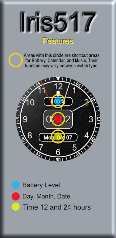 หน้าปัดนาฬิกา Iris517 มุ่งหวังที่จะมอบประสบการณ์ที่สอดคล้องกันบนแพลตฟอร์มสมาร์ทวอทช์ต่างๆ แต่คุณสมบัติบางอย่างอาจแตกต่างกันไปขึ้นอยู่กับรุ่นของนาฬิกา แม้ว่าคุณสมบัติหลัก เช่น เวลา วันที่ และตัวเลือกแบตเตอรี่ได้รับการออกแบบมาให้สามารถเข้าถึงได้บนอุปกรณ์ส่วนใหญ่ แต่ฟังก์ชันบางอย่างอาจทำงานแตกต่างออกไปหรืออาจไม่พร้อมใช้งานในนาฬิกาบางเรือนเนื่องจากความแตกต่างของฮาร์ดแวร์หรือซอฟต์แวร์
