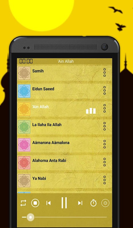 Islamic ringtones contains more than 36 Islamic songs like 99 names of Allah, Ya taiba, ilahi anta maqsudi, arkan al islam (Five Pillars of Islam song ), assalamo alaykom, forgive me allah, ramadan ringtones.