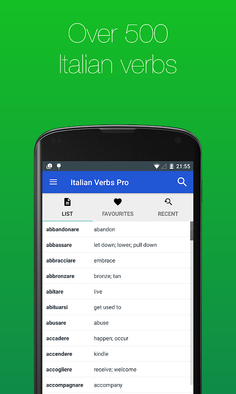ดูคำกริยาอิตาลีมากกว่า 500 คำใน 18 กาล ด้วยการนำทางที่ง่ายและการค้นหาในตัวคุณสามารถค้นหาคำกริยาที่คุณต้องการในไม่กี่วินาที