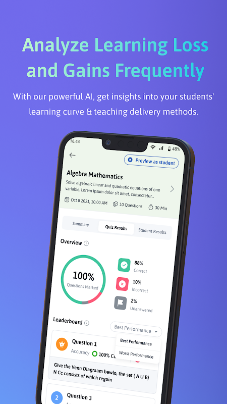 การประเมินประสิทธิภาพ: ค้นหาว่าคำถามใดที่นักเรียนประสบปัญหามากที่สุด วิเคราะห์ประสิทธิภาพของนักเรียนแบบเรียลไทม์ กำหนดเกณฑ์มาตรฐานของชั้นเรียน และทำความเข้าใจว่าบทและหัวข้อใดที่นักเรียนกำลังประสบปัญหาและปรับปรุง