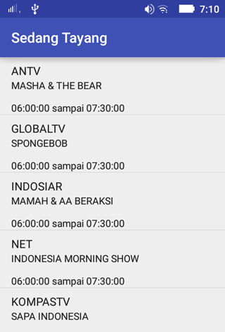 Aplikasi ini berisi informasi jadwal acara tv lokal yaitu ANTV, Global TV, Indosiar, NET, Kompas TV, Trans TV, Trans 7, RCTI, SCTV, RTV, MNCTV, TVONE dan iNewsTV.