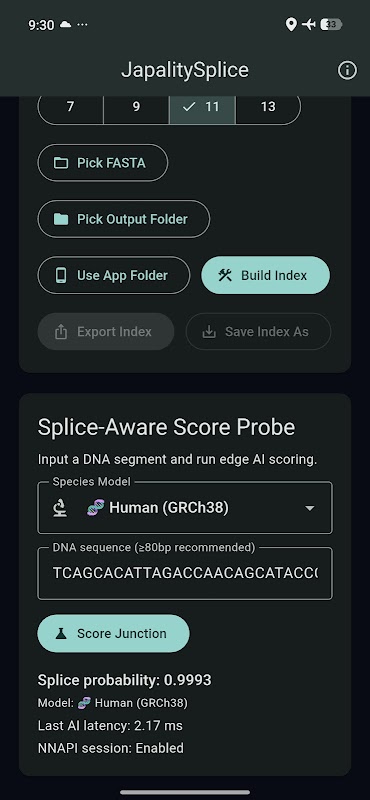 JapalitySplice คือซอฟต์แวร์ขั้นสูงสำหรับการจัดเรียงลำดับ RNA-Seq และการตรวจจับตำแหน่งการเชื่อมต่อ (splice site) บนอุปกรณ์ ออกแบบมาโดยเฉพาะสำหรับนักวิจัยด้านชีวสารสนเทศ นักพันธุศาสตร์ และนักศึกษาชีววิทยา ซอฟต์แวร์นี้ช่วยให้สามารถวิเคราะห์ลำดับข้อมูลได้อย่างมีประสิทธิภาพบนอุปกรณ์พกพา ทำให้สามารถประเมินจีโนมได้อย่างรวดเร็วและแม่นยำทุกที่ทุกเวลา