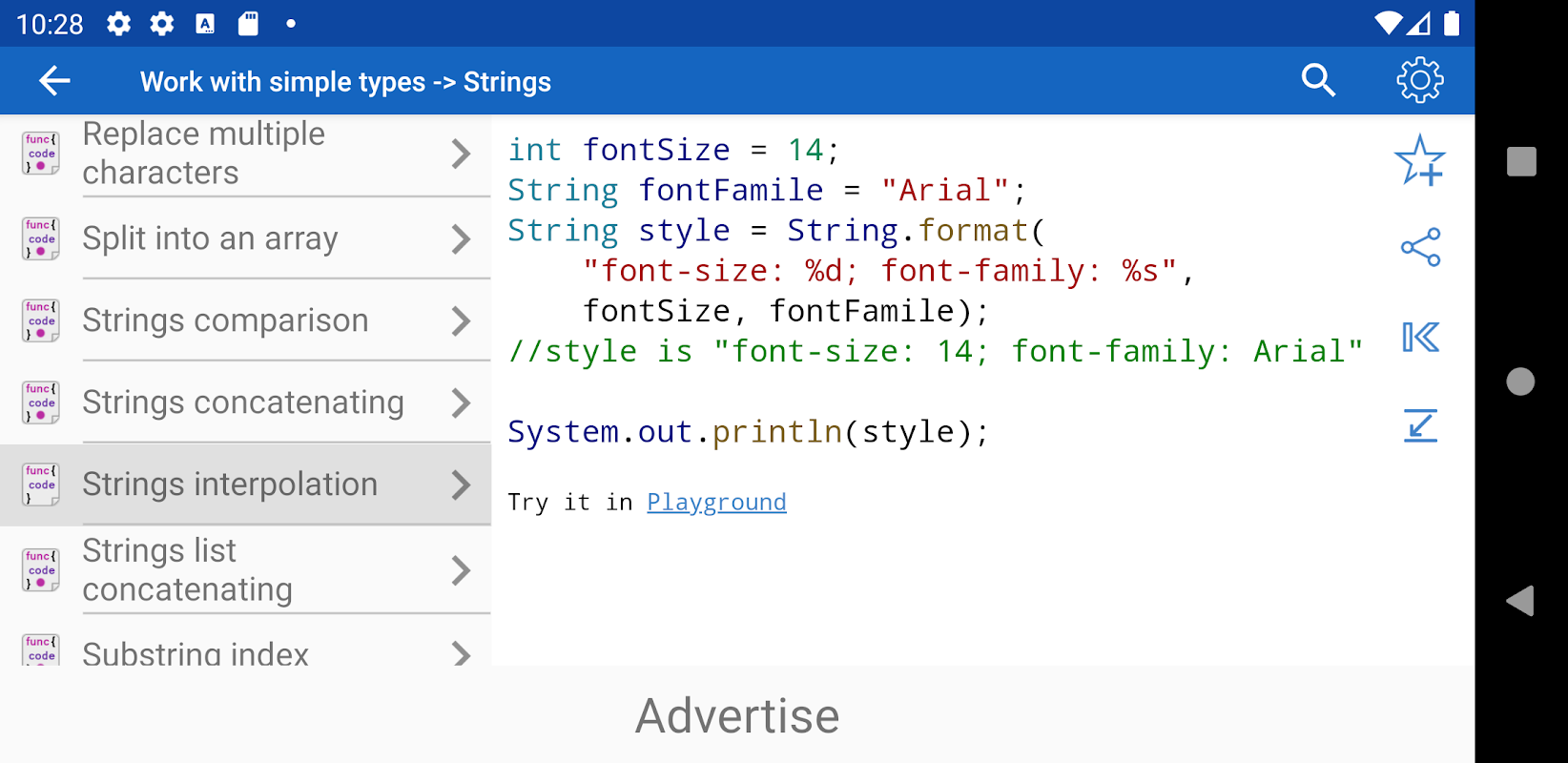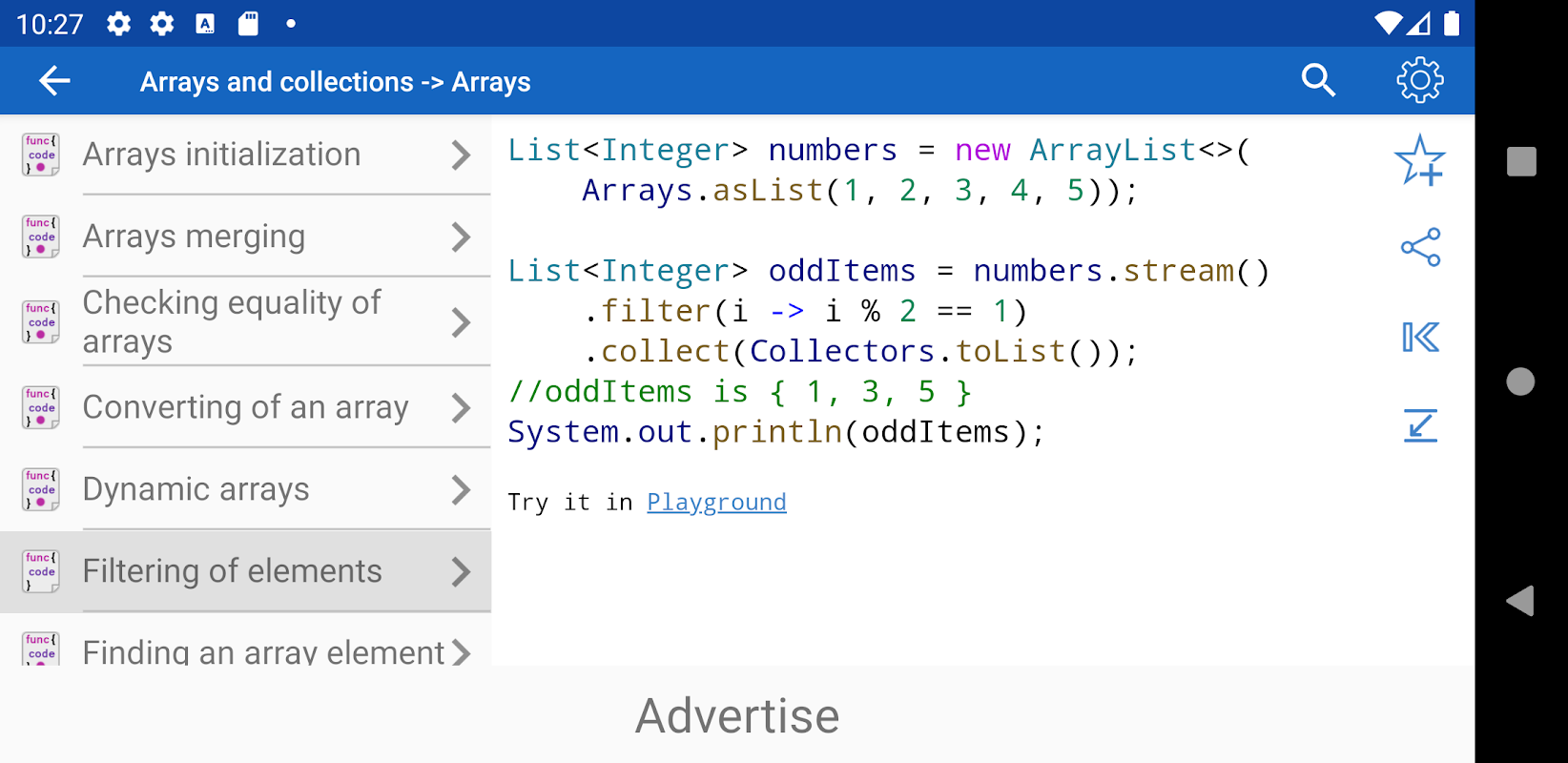 ✓การเรียนรู้ไวยากรณ์ Java ในตัวอย่างโค้ดเฉพาะ วิธีการรับสตริงย่อย วิธีการประกาศวิธีการทั่วไป? ตัวอย่างเหล่านี้และอีกกว่า 250 ตัวอย่างโค้ดสำหรับ Java มีอยู่ในแอ็พพลิเคชัน