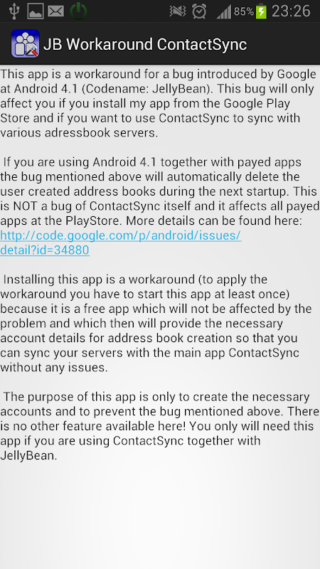 Diese App ist ein Workaround für einen Fehler, welcher von Google in Android 4.1 (Codename: JellyBean) eingebaut worden ist. Dieser Fehler betrifft Sie nur, wenn Sie die App im PlayStore gekauft haben und Sie ContactSync verwenden möchten, um sich mit verschiedenen Servern zu synchronisieren.