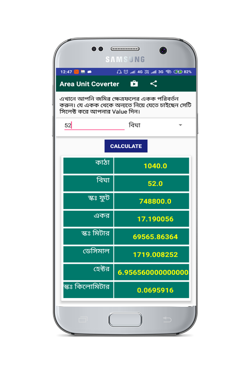 - you can convert area unit of land like katha, bigha, acres, Sq. meter, sq kilo meter, sq. feet,decimal etc.