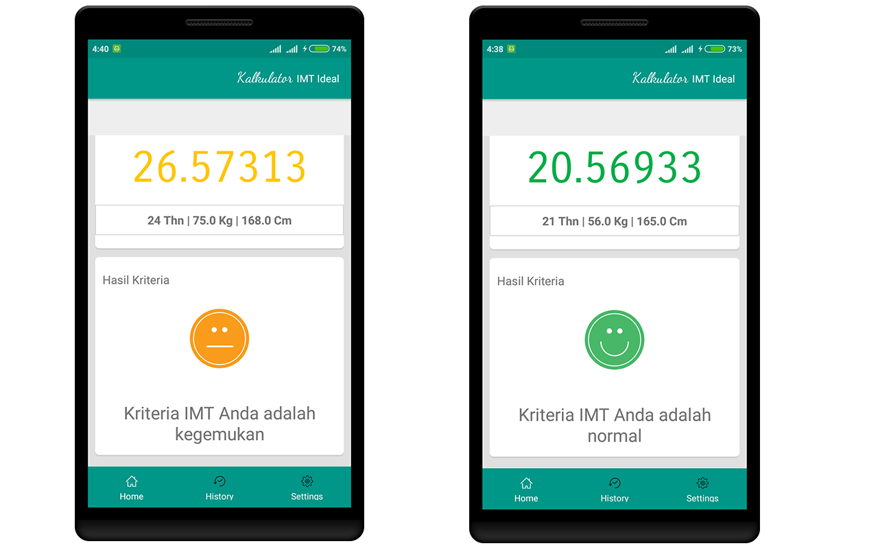 Aplikasi Kalkulator Indeks Masa Tubuh (IMT) Ideal merupakan aplikasi untuk menghitung dan mengevaluasi Indeks Masa Tubuh Anda berdasarkan informasi yang relevan. Aplikasi ini juga dapat digunakan untuk menemukan berat badan sehat anda jika anda ingin menurunkan berat badan anda atau sedang diet.