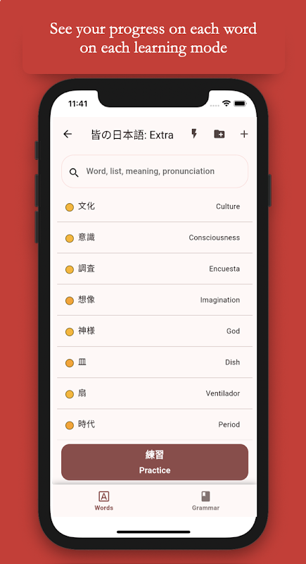 - แต่ละรายการจะมีคันจิ คำ หรือประโยคมากเท่าที่คุณต้องการ พร้อมความหมาย การออกเสียง และการถอดความ