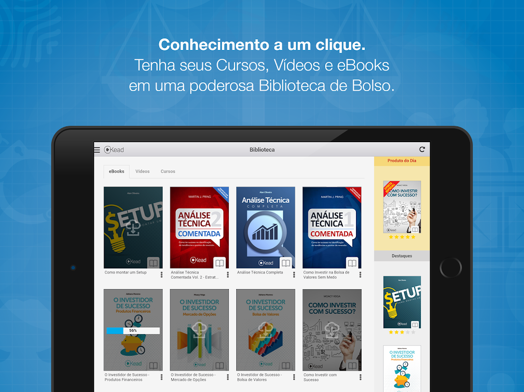 Perfeito para profissionais e estudantes, além de comportar eBooks em formato ePub, o Kead possui conteúdo também em vídeos, cursos, palestras online, simulados e exercícios.