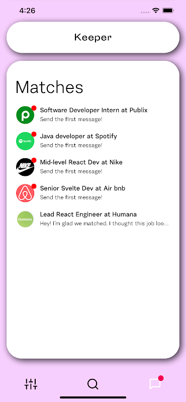 แอป Keeper เปิดตลาดสำหรับผู้มีความสามารถด้านเทคโนโลยีและผู้ที่ต้องการจ้างพวกเขาเพื่อเชื่อมต่อ มีผู้ใช้สองประเภทที่แตกต่างกัน วิศวกรซอฟต์แวร์ที่กำลังมองหางาน หรือใครก็ตามที่มีตำแหน่งว่างที่กำลังมองหาวิศวกรซอฟต์แวร์