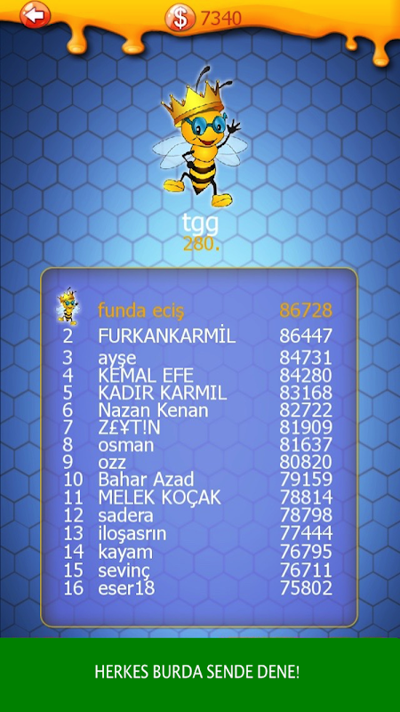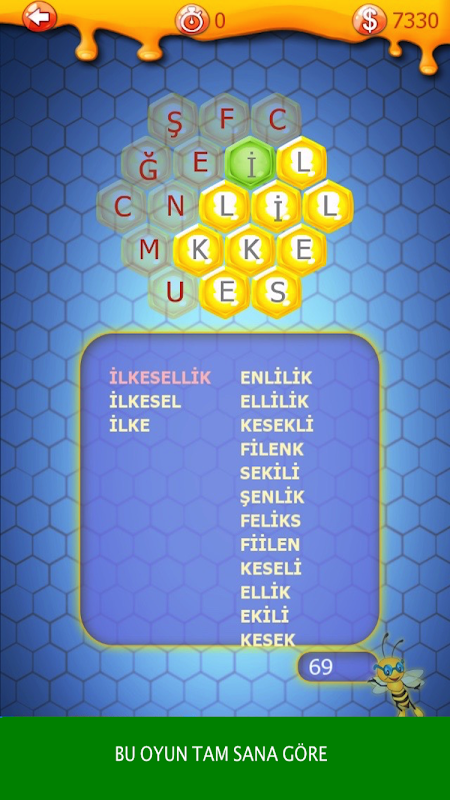 Petek üzerine yerleştirilmiş harflerden en çok sayıda kelimeyi 2 dakika içersinde bulmaya çalışın. Başkaları ile yarışarak keyifli anlar geçirin.