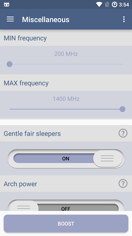 Kernel Booster is the simplest application for kernel tuning and controlling. Just set a governor and simply tune it for increasing battery life or performance by slider. Kernel Booster also allows you to choose your scheduler according to effect on your battery life, multitasking or performance. You can also modify other kernel features like MIN / MAX frequency settings, CPU idle mode, and many more.