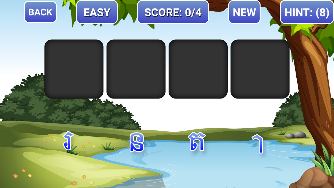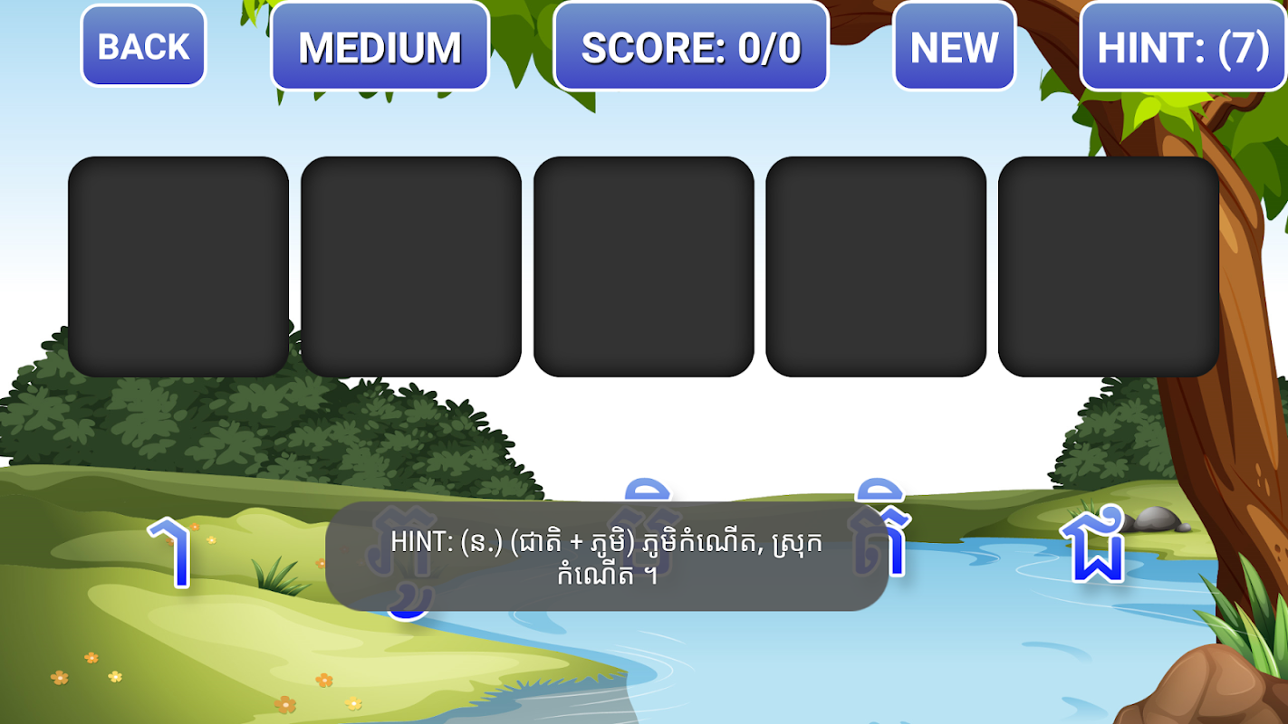 ค้นหาคำศัพท์ภาษาเขมรจากตัวอักษรและสระภาษาเขมรที่จัดเรียงแบบสุ่ม เกมนี้คล้ายกับเกมไขปริศนาคำศัพท์ภาษาอังกฤษอื่นๆ ที่สร้างตัวอักษรและสระขึ้นมาแบบสุ่ม คำศัพท์เหล่านี้ดึงมาจากพจนานุกรม Chuon Nath (ជួន ណាត) มีเกมไขปริศนาคำศัพท์เกือบ 5,000 เกมให้เล่นแบบสุ่ม
