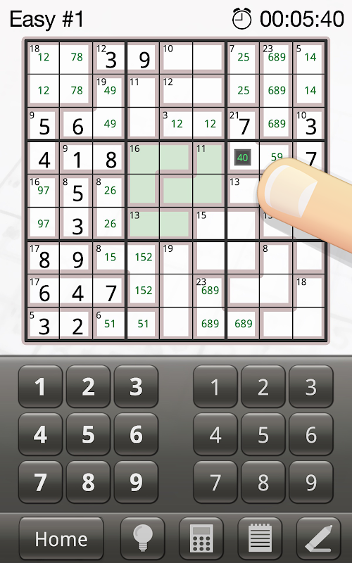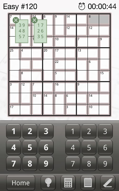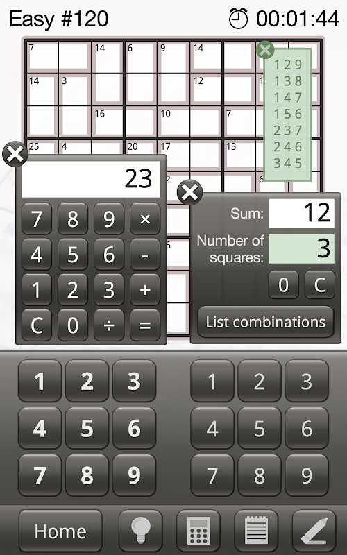 Solving a killer sudoku puzzle requires a lot of notes, so we worked hard to make the note entry features in this app perfect. A dedicated note keypad and the ability to select multiple squares makes entering notes fast. You can even make combination lists that float above the puzzle and can be rearranged on the screen!
