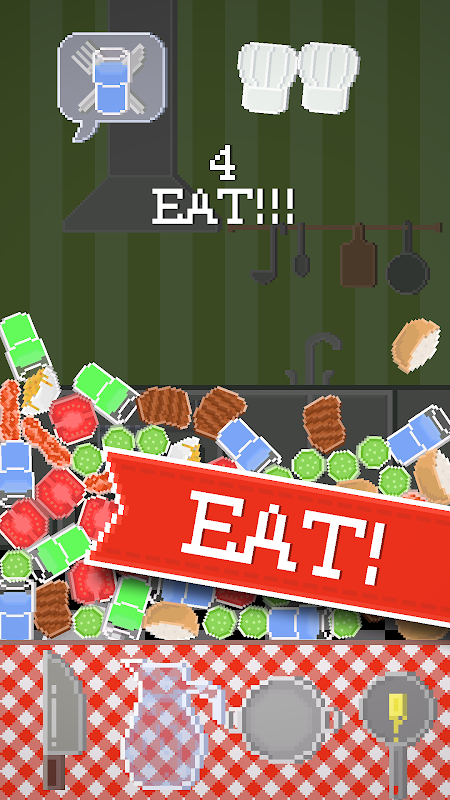 In Kitchen Complications, you have to prepare as much food as possible by throwing kitchen tools at falling unprepared food. When it is time to eat, you eat what the master chef tells you to eat. But you best eat more than your belly can contain and you best throw your tools with grace and elegance, because if you don't, the food will spoil and the chef will get more and more furious with you.