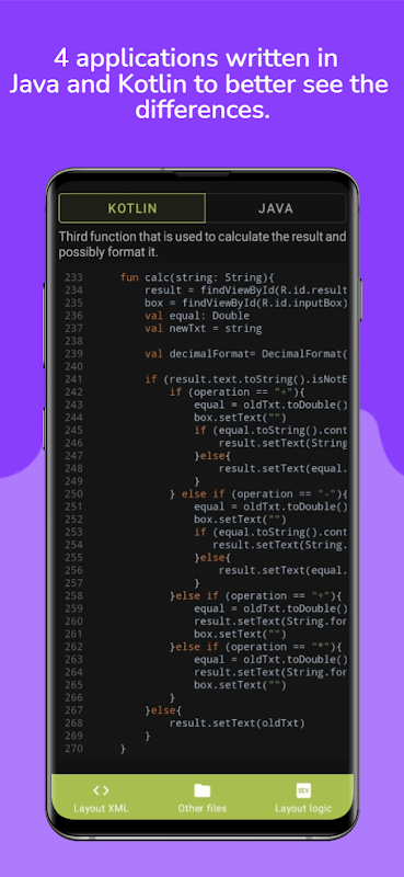 + แต่ละโลจิคัลโค้ดเขียนด้วย Java และ Kotlin ดังนั้นคุณจึงตัดสินใจได้เองว่าภาษาการเขียนโปรแกรมใดที่เหมาะกับคุณมากกว่า