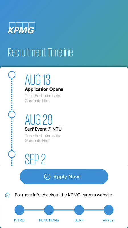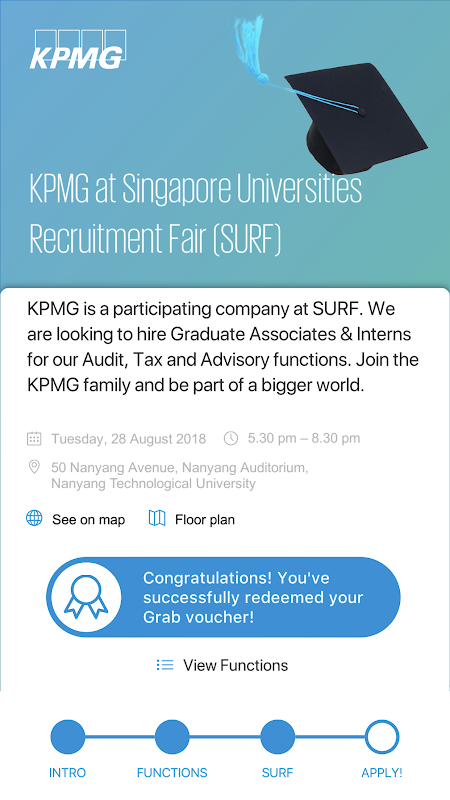 KPMG@SURF will help navigate your job search with KPMG at the Singapore Universities Recruitment Fair (SURF). It carries information on the company, offer you a snapshot on our business, guide you to our KPMG ambassadors and even offers you the opportunity to win a free Grab voucher. Download KPMG @SURF before SURF and be part of a bigger world.