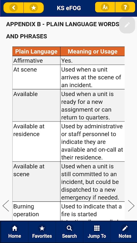 แอพมือถือ KS eFOG ช่วยให้ผู้ใช้เข้าถึงข้อมูลการสื่อสารฉุกเฉินด้านความปลอดภัยสาธารณะได้อย่างง่ายดาย โดยนำเสนอดัชนีเนื้อหาและลิงก์สำหรับการข้ามไปยังส่วนอ้างอิง ตาราง รูปภาพ หรือรูปภาพอย่างรวดเร็ว ความสามารถในการบันทึกรายการโปรดและสร้างบันทึกในบรรทัดช่วยให้สามารถเข้าถึงข้อมูลสำคัญในแบบเฉพาะตัวได้ สามารถดาวน์โหลด KS eFOG แล้วนำไปที่ภาคสนามเพื่อเป็นข้อมูลอ้างอิงแบบออฟไลน์ เพื่อนำไปใช้โดยไม่จำเป็นต้องเชื่อมต่ออินเทอร์เน็ต