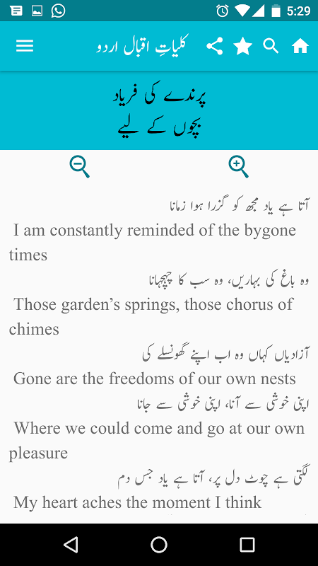 ผู้ใช้สามารถเรียกดูข้อความที่ชัดเจนแบบออฟไลน์ของบทกวี Urdu ที่สมบูรณ์แบบของเขาเช่น Bang-e-Dara, Bal-e-Jibreel, Zarb-e-Kaleem และ Arumghan-e-Hijaz (Urdu) ในสคริปต์ Nastalique เมื่อเลือกตัวเลือกการแปลภาษาอังกฤษคุณสามารถอ่าน, คัดลอกและแชร์ภาษาอังกฤษที่แท้จริงของงานภาษาอูรดูได้ทั้งหมด นอกเหนือจากการค้นหาในแถบข้อความแล้วผู้ใช้ยังสามารถเลือกคำใดก็ได้ตามลำดับตัวอักษรจากบทกวีของเขา ผลการค้นหาแสดงโองการทั้งหมดที่มีข้อความจากแถบค้นหาหรือคำที่เลือก โองการที่ค้นหาเหล่านี้เป็นประตูสู่บทกวีทั้งหมด Ghazal, Satirical หรือ Quatrain แล้วแต่กรณี หนึ่งสามารถอ่าน, ทำเครื่องหมายและบันทึกรายการโปรดของเขาและแบ่งปันผ่านทางอีเมลหรือโซเชียลมีเดีย