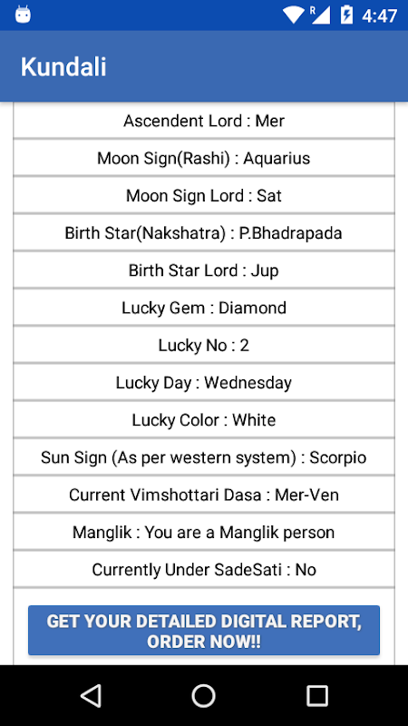 We often find the Kundli difficult to understand as it is made by astrologers using complex mathematical formulas. However, using this app will place you in a better position to understand what your Kundli indicates. The application is user friendly, simple and efficient.