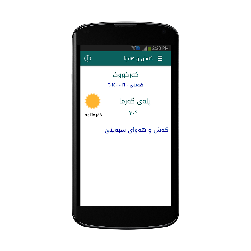 یهكهمین ئهپ به زمانی شیرینی كوردی بۆ ئاگاداربون له كهش و ههوای شاره كوردیهكان به ڕووكارێكی ساده و جوان ، له ڕێگهی ئهم ئهپهوه دهتوانیت ئاگاداری پلهی گهرما بیت به شێوهیهكی ورد و باوهڕپێكراو كه ئامارەکانی کەش و ههوا هەموو کاتژمێرێک جارێک نوێ دەبنەوە به شێوهیهیهكی خۆی(ئۆتۆماتیكی) ، زانیارییەکانمان لە چەندین سەرچاوە و ئینستیتوتی جیهانی بواری کەش و هەوا وەردەگیرێن .