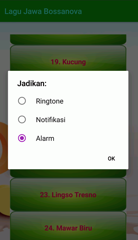 เพลงชวา Bossanova ประกอบด้วยคอลเลกชันเพลงชวาที่ดีที่สุดในจังหวะแจ๊ส Bossa Nova เช่น Alun - Alun Nganjuk, Ilat Tanpo Balung, Layang Kangen, Nandang Bronto เป็นต้น ติดตั้งและเพลิดเพลินกับการผสมผสานระหว่างเพลงชวากับเพลง Bossanova ที่สวยงาม คุณสามารถเพลิดเพลินกับเพลงทั้งหมดได้แม้ว่าคุณจะไม่ได้เชื่อมต่อกับอินเทอร์เน็ตก็ตาม เพลง Bossanova ของชวาทุกเพลงสามารถใช้เป็นเสียงเรียกเข้า การปลุก และการแจ้งเตือนได้