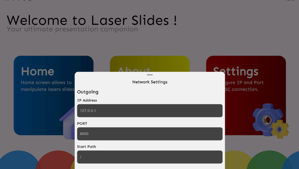 -- เมื่อเราทราบที่อยู่ IP แล้ว ให้เริ่มแอปพลิเคชันเลเซอร์สไลด์บนอุปกรณ์แท็บเล็ต เราควรกำหนดการตั้งค่าเพื่อควบคุมสไลด์ในซอฟต์แวร์ BEYOND
