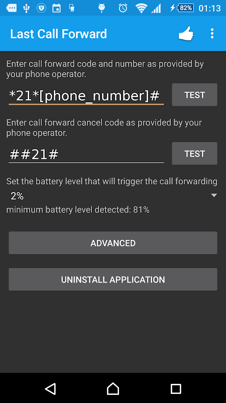 There are various types of call forward codes, but since it's assumed that there is no battery left on your device, you only need the "forward all calls" code. There is a test button next to each field in the application. You can use it to test if the call forward codes are working.