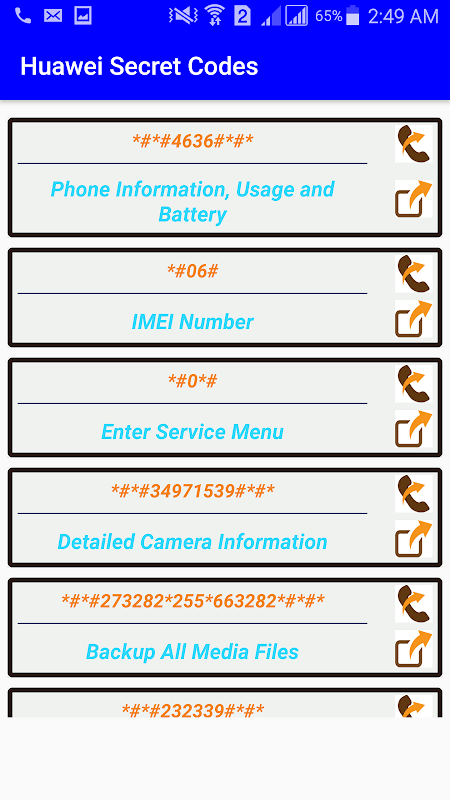 ขณะนี้คุณสามารถค้นพบโลกแห่งความลับของอุปกรณ์เคลื่อนที่ที่ใช้ Android ได้แล้ว รหัสของคุณบางรหัสอาจไม่ทำงานบนอุปกรณ์บางอย่าง แต่คุณยังสามารถลองใช้ได้เนื่องจากผู้ผลิตไม่อนุญาต เมื่อรหัสเหล่านี้เขียนด้วยตนเองจากแป้นโทรศัพท์ หรือคุณสามารถคัดลอกรหัสนี้โดยกดที่รหัสค้างไว้แล้ววางลงในคลิปบอร์ด นอกจากนี้ยังมีคุณสมบัติในรหัสลับของ Huawei เพื่อแชร์กับแอปโซเชียลแบบออฟไลน์และฟรี