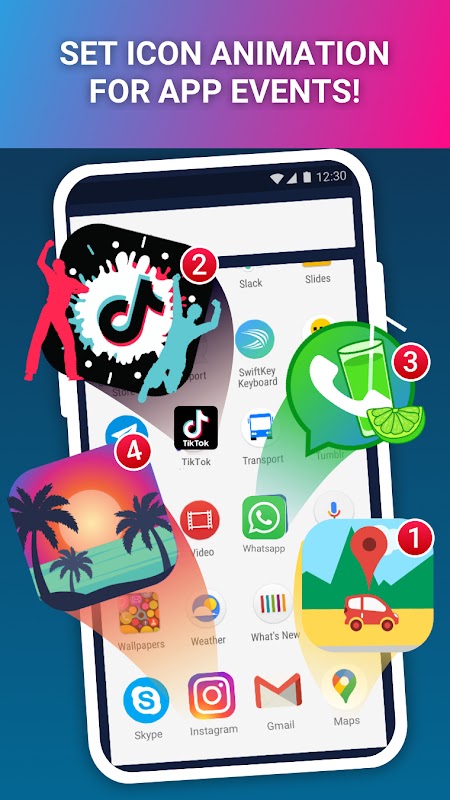 Say "NO!" to boring icons of your favorite games, utilities, instant messengers and social networks on your home screen! Set any of the animation modes: event within the app, constantly animated icon or not animated icon.