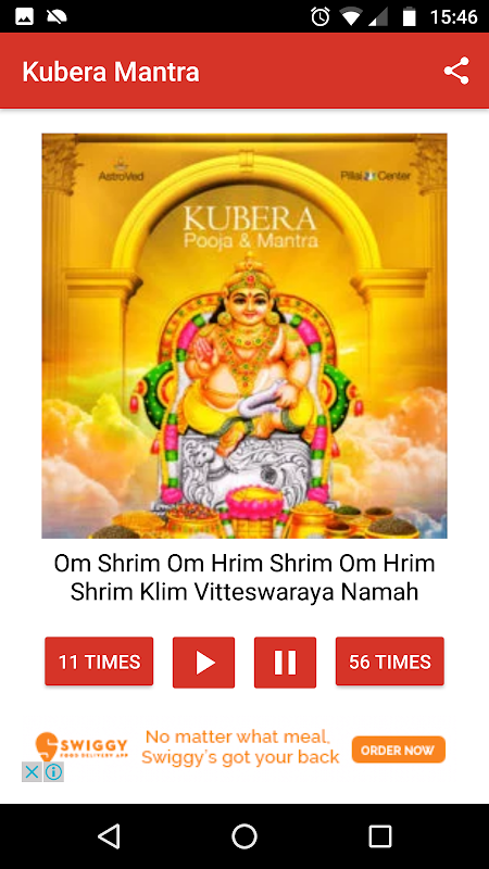 Laxmi Kubera Mantra 108 times audio free app lets you play Laxmi Kubera Mantra audio mp3 on loop for 108 times, 56 times or 11 times.