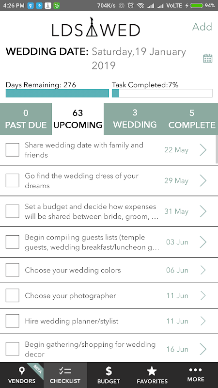 Everything you need to know and do to have a perfect wedding day! Simply enter your wedding date and it auto-calculates everything you need to complete and the suggested day it should be completed on.