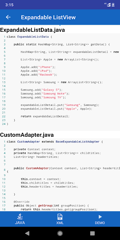 แอปประกอบด้วยบทเรียนแบบอักษร ตัวอย่างโค้ดตัวอย่างและคำอธิบายเชิงทฤษฎี คุณสามารถเรียนรู้แนวคิดพื้นฐานของการพัฒนาแอพ android, แนวความคิดและตัวอย่างการพัฒนา android ระดับเริ่มต้นพร้อมด้วยรหัสและการสาธิต, คุณสมบัติระดับ android ขั้นสูงพร้อมรหัสและการสาธิต, รหัสแอป android ระดับมืออาชีพพร้อมคำอธิบายและกลุ่มข้อมูลที่เป็นประโยชน์ และความรู้เกี่ยวกับสิ่งสำคัญต่าง ๆ ที่เกี่ยวข้องกับการพัฒนาแอพ Android นอกจากนี้เรายังมีแอพมืออาชีพ 9 แอพที่พัฒนาขึ้นอย่างสมบูรณ์พร้อมกับเทคนิคการเขียนโค้ดสำหรับการพัฒนาแอนดรอยด์ขั้นสูงซึ่งคุณสามารถซื้อและพัฒนาทักษะของคุณต่อไป