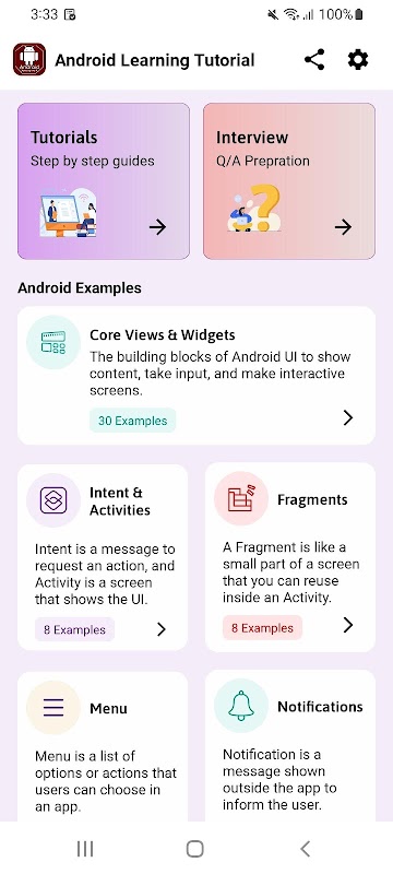 แอป Learn Android – บทช่วยสอนการพัฒนาแอปนี้ออกแบบมาเพื่อให้คุณได้เรียนรู้การเขียนโปรแกรม Android การพัฒนา Android และการพัฒนาแอป Kotlin ทีละขั้นตอน เป็นคู่มือฉบับสมบูรณ์สำหรับผู้เริ่มต้นและนักพัฒนา Android ที่ต้องการสร้างแอปพลิเคชัน Android แอปนี้ใช้งานง่าย ครอบคลุมตั้งแต่พื้นฐานไปจนถึงแนวคิดขั้นสูง และเข้าใจง่าย ขอแนะนำให้มีความรู้เกี่ยวกับ Kotlin แต่ไม่บังคับ