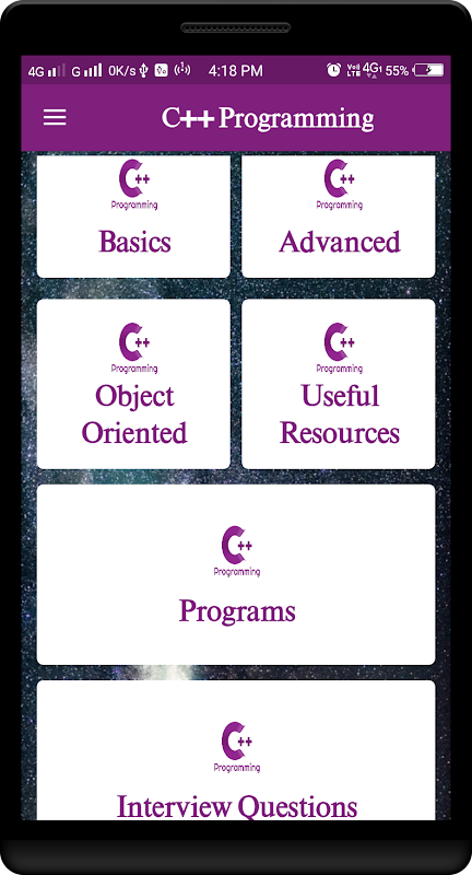 C++ Programming app includes over 80 lessons split into 9 levels that cover basic concepts, data types, arrays, pointers, conditional statements, loops, functions, classes and objects, inheritance & polymorphism, templates, files and exceptions.