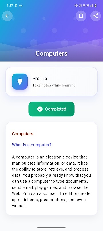 🌐 เข้าถึงแบบออฟไลน์ได้ 100%: เรียนรู้คอมพิวเตอร์ได้ทุกที่ ทุกเวลา! บทเรียน แบบทดสอบ และแบบฝึกหัดทั้งหมดสามารถใช้งานได้แบบออฟไลน์โดยสมบูรณ์ ไม่จำเป็นต้องเชื่อมต่ออินเทอร์เน็ตหลังจากดาวน์โหลดครั้งแรก