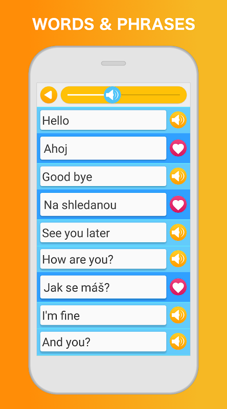 เมื่อใช้แอปนี้เพื่อเรียนภาษาเช็กคุณจะได้เซ็ทสมุดวลีที่มีคำทักทาย, บทสนทนา, ตัวเลข, งานอดิเรก, ที่อยู่อาศัย, คำคุณศัพท์, สัตว์, สี, เสื้อผ้า, ประเทศ, ทิศทาง, เหตุฉุกเฉิน, อาหาร, ความลำบากทางภาษา, คำถาม, วลี, ประโยค และคำอื่น ๆ ในภาษา (language)