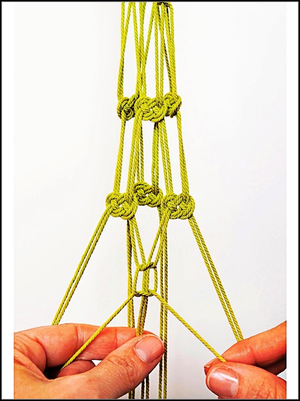 The cord knotting can change from one step to the next according to the macrame pattern to be made.