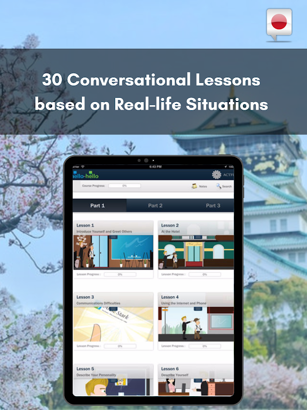 ญี่ปุ่น Hello-Hello เป็นหลักสูตรภาษาเต็มเปี่ยมด้วย 30 บทเรียนในการพัฒนาความร่วมมือกับอเมริกันสภาการเรียนการสอนภาษาต่างประเทศ (ACTFL) เพื่อให้คุณสามารถมั่นใจได้ว่าบทเรียนเหล่านี้ปฏิบัติตามระเบียบวิธีวิจัยที่มีประสิทธิภาพ บทเรียนทั้งหมดจะขึ้นอยู่สนทนากับบทสนทนาและสถานการณ์ที่เป็นจริงมากกว่าการเก็บรวบรวมของคำที่ออกจากบริบทและวลี