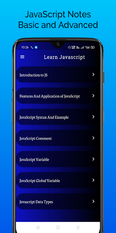 “Learn JavaScript - Programming Tutorials” app has a really simple and interactive UI. It is the best app to let you learn the JavaScript programming language for free. So, what are you waiting for? Download the app now to become an expert at JavaScript Programming Languages