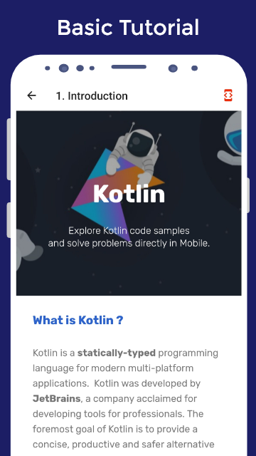 Kotlin tutorial ออฟไลน์ให้แนวคิดพื้นฐานและขั้นสูงของภาษาการเขียนโปรแกรม Kotlin แบบฝึกหัด Kotlin ของเราออกแบบมาสำหรับผู้เริ่มต้นและมืออาชีพทั้งคู่
