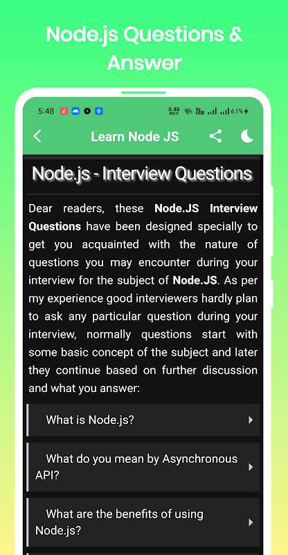 Learn Node JS เป็นแอปฟรีที่ทำให้ง่ายต่อการเรียนรู้ Node JS และทดลองใช้โครงการแบบเรียลไทม์ คุณสามารถใช้แอพ Learn Node JS tutorials ทีละขั้นตอน ทดลองกับโค้ดในแต่ละบทเรียนโดยใช้ Node interpreter และอื่นๆ เพื่อเรียนรู้แนวคิดพื้นฐานของ Node ตั้งแต่เริ่มต้นจนถึงระดับสูง