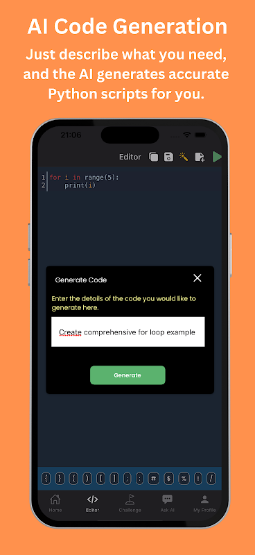การสร้างโค้ด AI: ดิ้นรนเพื่อเขียนโค้ดใช่ไหม? เพียงอธิบายสิ่งที่คุณต้องการ แล้ว AI จะสร้างสคริปต์ Python ที่แม่นยำให้กับคุณ ตัวอย่างเช่น ขอให้สร้าง "for loop" หรือโปรแกรมที่สมบูรณ์ ง่ายมาก! Python Editor จะจัดการคำขอของคุณอย่างมีประสิทธิภาพ