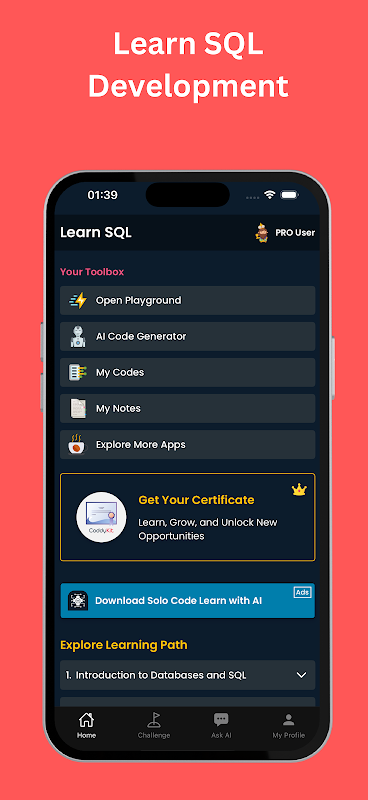 ตัวแก้ไข SQL แบบโต้ตอบ: ฝึกเขียนคำสั่ง SQL โดยตรงในแอปโดยใช้ตัวแก้ไข SQL ในตัวและฐานข้อมูลสดของเรา เรียกใช้คำสั่งเช่น SELECT, INSERT, UPDATE, DELETE และ JOIN และดูผลลัพธ์ได้ทันที แก้ไขตาราง สร้างสคีมา และทดลองกับชุดข้อมูลในโลกแห่งความเป็นจริง ทุกสิ่งที่คุณทำเกิดขึ้นภายในสภาพแวดล้อมแบบแซนด์บ็อกซ์ที่ปลอดภัยซึ่งทำงานเหมือนกับกลไก SQL จริง โดยไม่จำเป็นต้องติดตั้ง