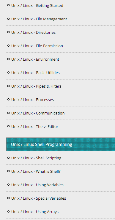 Unix, Linux, Tutorials, Learning, Operating, System, OS, Beginners, Basics, Korn, Bourne, Shell,Programming, Getting Started, File Permission / Access Modes, Environment, Utilities, Pipes and Filters, Network Communication Utilities, File System, Directories, Memory Management, Special Variables, vi editor, What is Shell?, Using Shell Variables, Arrays, Basic Operators, Decision Making, Loop Types, Control, Substitution, Quoting Mechanisms, Input / Output Redirections, Functions, Man Page Help, Regular Expressions with SED, User Administration, System Performance, Logging, Signals and Traps, Processes.